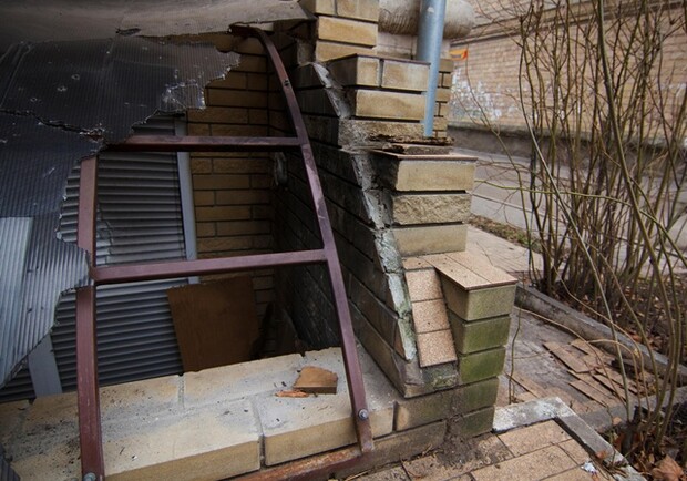 Разрушения от взрыва не слишком серьезные - покорежен навес над цокольным этажом, на земле валяются куски пластика, но окна на первом этаже пятиэтажки целы. Фасад здания выходит на центральный проспект Науки, здесь работает аптека.