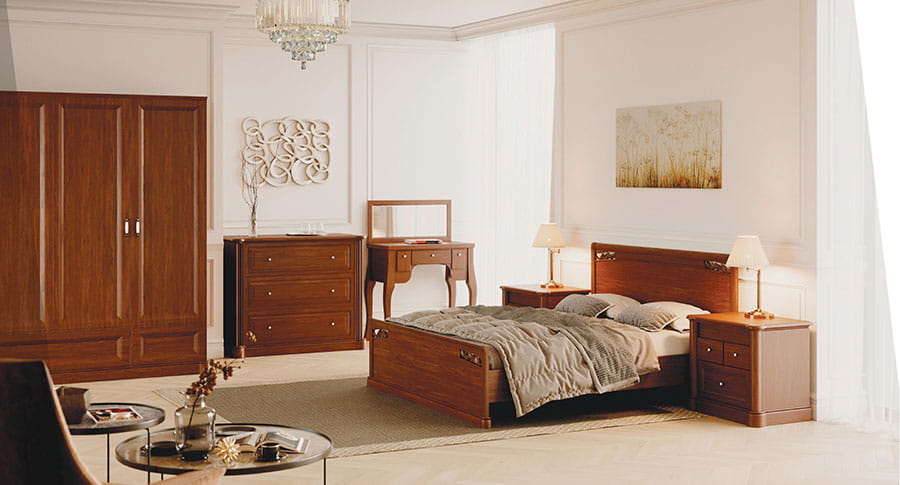 Производит и продает мебель для спальни из массива дерева оптом и в розницу (кровати, комоды, тумбы, туалетные столики, шкафы).