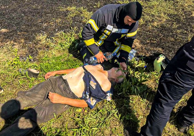 Знепритомнів біля вогню: чоловік ледь не згорів під час пожежі на Харківщині. Фото: ДСНС